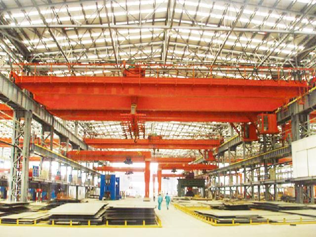 本起重機(jī)采用掛梁吊運(yùn)長件鋼坯、板材、棒材、盤圓等物品,配置電磁吸盤或夾鉗或特殊群鉤進(jìn)行吊裝,主要由箱形橋架、起重小車、大車運(yùn)行機(jī)構(gòu)、司機(jī)室和電氣控制系統(tǒng)組成,配有停電保磁系統(tǒng)。起升機(jī)構(gòu)多采用單電機(jī)、雙減速器、雙卷筒布置,呈雙吊點(diǎn)形式。掛梁布置形式分垂直于主梁或平行于主梁兩種。其余形式與QD型起重機(jī)相同。